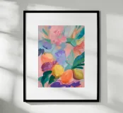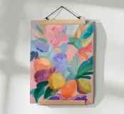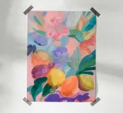 Un'opera d'arte colorata e astratta che cattura la vivacità della natura con pennellate dinamiche. Le vibranti tonalità di rosa, arancione e verde si fondono in un gioco estivo di frutta, foglie e forme floreali. Il motivo irradia gioia di vivere e ricorda le calde giornate estive e la libertà creativa.