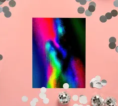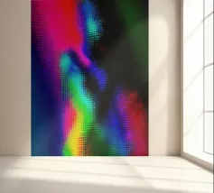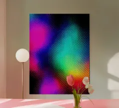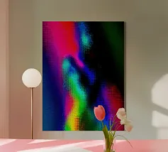 Questo intenso lavoro è un omaggio alla glitch art digitale e alla op art, realizzato con la buona vecchia texture analogica dello schermo a mezzatinta. L'esplosione di colori in massima saturazione celebra la luce, dal rosa neon al blu cibernetico. Nel caos visivo, la forma fluida di una donna nuda sembra danzare misteriosamente, la creatività che emerge dall'apparente disordine. Questo quadro è un'unione terapeutica di ebbrezza e tranquillità che trasforma qualsiasi spazio moderno in una dichiarazione d'arte ad alta energia. Quest'opera necessita di dimensioni e spazio per il suo pieno effetto.