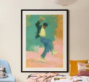 Un dipinto astratto mostra una figura in movimento con un top scuro, pantaloni blu e scarpe chiare. Le braccia tese e i capelli scuri si stagliano su uno sfondo strutturato con accenti turchesi, rosa e giallo oro. Le pennellate visibili creano consistenza e dinamismo.