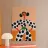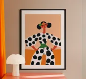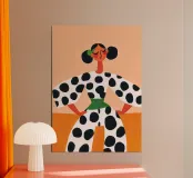 Una figura appariscente e sicura di sé domina questa illustrazione ispirata alla Pop Art, caratterizzata da linee decise e forme semplici. La donna, con il collo lungo stilizzato, le guance rosee e i capelli acconciati in due chignon scuri e rotondi, indossa un'accattivante tuta a maniche larghe. Il tessuto presenta un motivo a pois bianchi e neri irregolare e sovradimensionato, energico ed espressivo. Una cintura verde smeraldo a contrasto cinge la vita, aggiungendo un potente accento di colore alla stampa monocromatica. Lo sfondo è costituito da un blocco di caldo pesca/albicocca nella parte superiore e da una fascia di giallo arancio intenso/senape.
