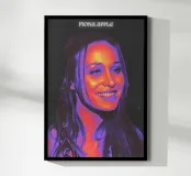 Fiona Apple sorride calorosamente, il suo viso si illumina di radiose sfumature rosse e blu.