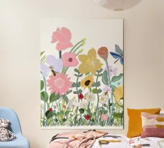 Il disegno dettagliato presenta una varietà di fiori vivaci visitati da api indaffarate.