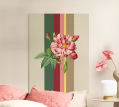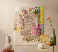 Questa vibrante arte digitale astratta combina colori brillanti e texture glitterate ispirate a motivi botanici. Le strisce orizzontali in rosa, arancione, blu e verde portano nuova energia in ogni spazio abitativo e celebrano la bellezza della natura colorata.