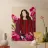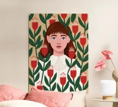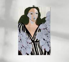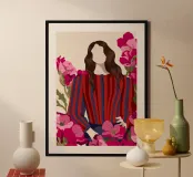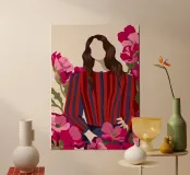 Un dipinto di una persona con un vestito a righe rosse e blu, circondata da fiori rosa.