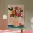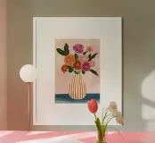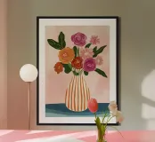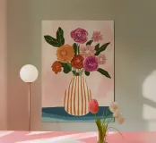 Un quadro floreale astratto allegro ed espressivo, ricco di colori vivaci. Il bouquet stilizzato presenta papaveri e ranuncoli astratti in tonalità vivaci di arancione, rosa caldo e magenta, contrastati nettamente da foglie verde intenso. La composizione è contenuta in un elegante vaso Mid-Century Modern a strisce verticali arancioni e bianche, che richiama le ceramiche e l'arte grafica della metà del secolo scorso. Lo sfondo è di un rosa tenue, ancorato da una striscia di verde acqua intenso lungo il fondo, che offre un eccellente contrasto cromatico. Questo pezzo è puro Dopamine Decor, che porta gioia immediata in ogni stanza.