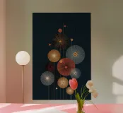 Un'impressionante esibizione di fuochi d'artificio astratti resi in una pulita geometria Bauhaus. Linee radianti e audaci esplosioni circolari illuminano la tela scura con un contrasto festoso e un tocco minimalista. Una celebrazione del movimento, del ritmo e della magia delle feste, perfetta per gli interni moderni alla ricerca di un tocco stagionale unico.