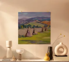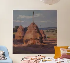 Un dipinto di paesaggio con un grande pagliaio in un campo vicino a un fiume o a uno specchio d'acqua tranquillo. Il cielo è di un grigio tenue e coperto, e la tavolozza generale è sobria con toni terrosi.