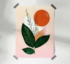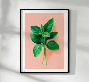 Lussureggiante illustrazione di un mazzo di foglie di basilico verde brillante su un morbido sfondo color pesca. Questa stampa moderna per la cucina conferisce una fresca atmosfera di cucina italiana al vostro spazio e aggiunge un accento pulito ed erbaceo alla parete della vostra dispensa o alla zona pranzo.