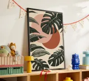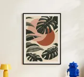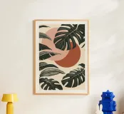 Foglie di Monstera tropicale con calde forme astratte di sole carta hahnemühle