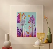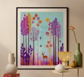 Foresta incantata colorata con cervi e uccelli carta hahnemühle