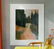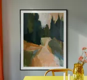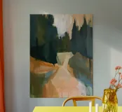 Paesaggio astratto dipinto con verdi profondi e calde tonalità della terra, che suggerisce un tranquillo sentiero nella foresta immerso in una luce soffusa.