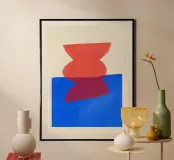 Una vibrante forma rossa è posizionata sopra una superficie blu intenso, creando un contrasto sorprendente. La semplicità della forma esalta la sua audace interazione cromatica.