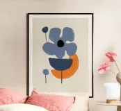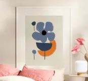 Una composizione minimalista e sofisticata presenta due fiori blu stilizzati su steli eleganti su uno sfondo neutro e colorato, incarnando il principio del "meno è meglio".