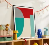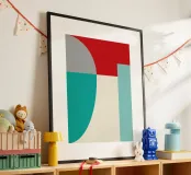 Un'audace composizione astratta con forme geometriche nei toni del rosso, del verde acqua, del grigio e del beige. Il design è semplice e moderno e mette in risalto il contrasto di colori.