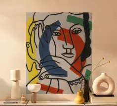 Questo dipinto mostra una composizione astratta con un mix di forme geometriche e organiche. I colori sono decisi e comprendono il nero, il blu, il rosso e il bianco. Le forme si sovrappongono e creano un senso di profondità.