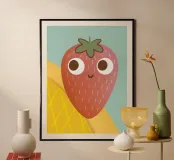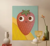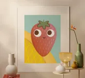 Allegra illustrazione con una simpatica fragola dal dolce sorriso, che irradia felicità e freschezza.