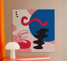 Un'opera d'arte astratta vibrante ed espressiva con una fusione di colori audaci di ispirazione fauvista come il magenta, l'arancione e il nero. Le pennellate e le forme energiche creano un'opera dinamica e appassionata.