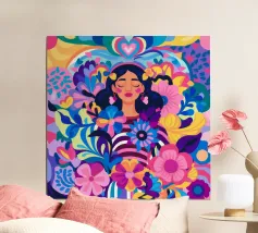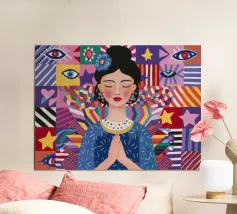Il dipinto presenta una persona circondata da motivi intricati e colorati, creando una composizione dinamica e vivace.