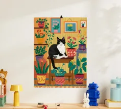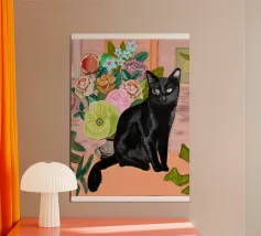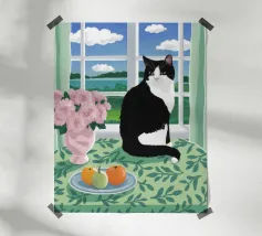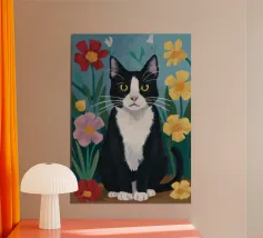 Un gatto bianco e nero siede regalmente dietro un grande vaso di fiori con motivi a strisce vivaci, sullo sfondo di una tenda rosa, creando una natura morta suggestiva e affascinante.