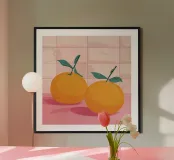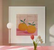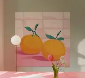 Due mandarini perfettamente rappresentati e strutturati con foglie verdi fresche si appoggiano su uno sfondo di piastrelle rosa tenue, creando una natura morta semplice, bella e moderna.