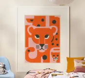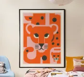 Modernità giocosa con un look retrò: questa affascinante composizione riduce i leopardi a forme geometriche di base. Il vivace tricolore - arancione brillante, rosa tenue, grigio intenso - ricorda il design scandinavo degli anni '60 e le illustrazioni naturalistiche di Charley Harper. Le forme bidimensionali e i tratti del viso minimalisti mostrano influenze del Bauhaus e della grafica di metà secolo. Madre e cucciolo appaiono come pezzi di un puzzle astratto, allo stesso tempo carino e sofisticato. Un equilibrio perfetto tra semplificazione ingenua e design perfetto.