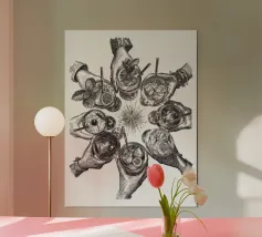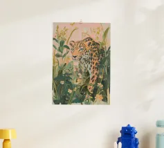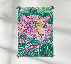 Questo non è un normale safari. È un'avventura rosa ambientata in una lussureggiante foresta tropicale, dove gatti, tigri, leopardi, zebre, giaguari e ghepardi vivacizzano le decorazioni murali con un tocco pop-art. In questo quadro dalle linee raffinate, un ghepardo rosa acceso si adagia tra il fogliame verdeggiante, lasciando che la sua tonalità vivace sia al centro della scena. Le foglie tropicali creano un contrasto sorprendente, rendendo questo pezzo un'attrazione immediata per il salotto o lo studio creativo.