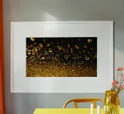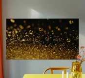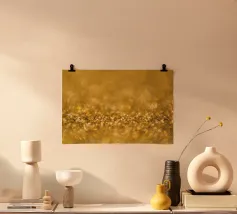 Gocce d'oro brillano su una superficie scura con un bokeh ipnotico carta hahnemühle