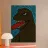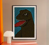 Questo poster dalla grafica intensa presenta un ritratto stilizzato e ravvicinato di un gigantesco rettile (che ricorda Godzilla o un drago di Komodo). La pelle della creatura è resa con un disegno dettagliato e tattile di ovali marroni simili a squame su uno sfondo nero. La bocca aperta rivela denti bianchi e affilati e una spessa lingua rossa ondulata di fuoco o plasma. L'immagine è altamente dinamica, su uno sfondo di linee orizzontali blu vibranti e pulsanti, che le conferiscono una forte estetica psichedelica e da poster a luce nera. I contorni decisi e la tavolozza dei colori ad alto contrasto ne fanno un perfetto esempio di Pop Art.