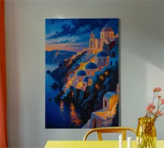 Questo vibrante dipinto a olio celebra la magica ora d'oro a Santorini. Illuminata dalle calde tonalità del tramonto, l'architettura bianca e blu dell'isola risplende di vita mentre scende dalle scogliere verso lo scintillante Mar Egeo. La pennellata dettagliata mette in risalto le texture della pietra, l'acqua scintillante e il delicato gioco di luci e ombre. Il dipinto evoca un senso di serenità e di bellezza senza tempo, rendendolo un omaggio a una delle destinazioni più iconiche e romantiche della Grecia.