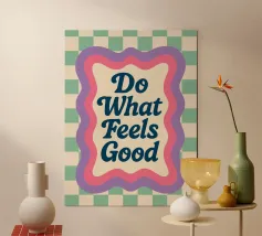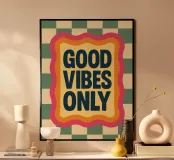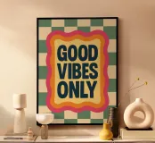 Un poster con citazioni di ispirazione vintage, con toni verdi e arancioni brillanti incorniciati da un bordo retrò ondulato. Progettato per portare positività e colore in qualsiasi spazio moderno.