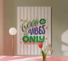 Diffondete la positività con questa divertente e vivace stampa digitale che riporta la frase motivazionale "GOOD VIBES ONLY". La scritta è resa in uno stile giocoso e sovrapposto, utilizzando una tavolozza luminosa e contrastante di viola, verde e giallo, accentuata da stelle stravaganti, fulmini e un'icona floreale sorridente. Lo sfondo è caratterizzato da morbide strisce bianche e rosa disegnate a mano con un'affascinante texture acquerellata. Questo pezzo è perfetto per aggiungere un tocco di colore, una dose di estetica retrò anni '70 e un messaggio positivo a una camera da letto, un ufficio o una parete della galleria. Offerto come file digitale di qualità superiore (7000x5000).