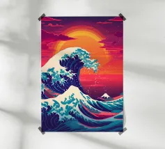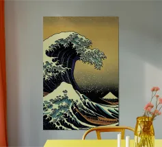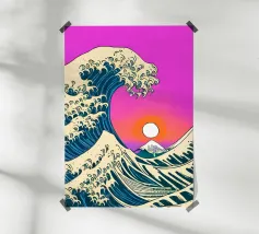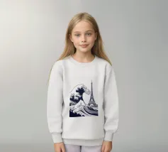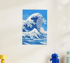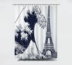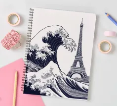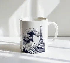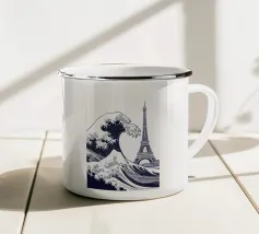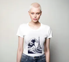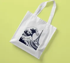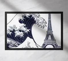L'immagine raffigura un'illustrazione stilizzata in bianco e nero della Grande Onda al largo di Kanagawa, una famosa xilografia giapponese, con la Torre Eiffel sovrapposta all'onda. L'onda è raffigurata in un movimento dinamico e vorticoso, con creste spumeggianti e una base blu intenso. La Torre Eiffel si erge alta e slanciata, con la sua struttura intricata che contrasta con la forma organica dell'onda.