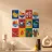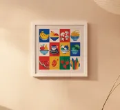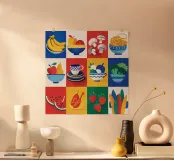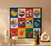 Una griglia colorata con nove diverse ciotole, ognuna contenente un diverso tipo di frutta, dalle banane alle fragole. L'opera d'arte è una celebrazione luminosa, allegra e organizzata di cibi sani e deliziosi.