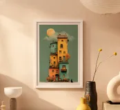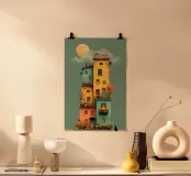 Un'opera d'arte verticale stilizzata che immortala una casa colorata e accatastata sotto la luna piena, decorata con zucche, alberi autunnali e finestre luminose. Un misterioso gatto nero se ne sta tranquillo davanti, aggiungendo un magico tocco di Halloween. Perfetto per gli interni che fondono l'atmosfera stagionale con la narrazione artistica.
