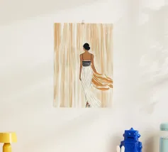 Una donna è raffigurata in morbide onde ondeggianti di tonalità dorate e terrose, che incarnano fluidità e tranquillità. La sua espressione è di dolce contemplazione, mentre si abbraccia in un momento di profonda riflessione. Lo sfondo si integra perfettamente con le sue forme, simboleggiando l'interconnessione tra le emozioni umane e la natura. Le pennellate calde e delicate creano una sinfonia visiva che evoca un senso di benessere e di appartenenza. Questo dipinto celebra la forza e la sensibilità della femminilità, fondendo l'astrazione moderna con una profondità emotiva senza tempo.