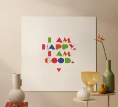 Un design tipografico audace e allegro con la frase edificante "Have a Good Day" in lettere grandi, grosse e colorate con un effetto semi-opaco su uno sfondo color crema. Questa opera d'arte divertente e positiva è pensata per diffondere gioia e rallegrare qualsiasi spazio. Perfetta per pareti colorate, interni allegri e capi d'abbigliamento che regalano sorrisi a tutti. Ideale per chi ama i disegni vivaci e di grande impatto con un tocco giocoso. Progettato da showmemars