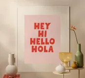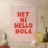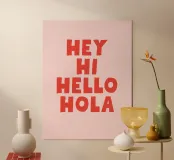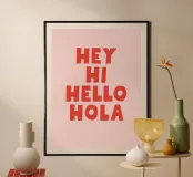 Un'opera tipografica moderna e giocosa con saluti in diverse lingue: HEJ, HEY, HI, HELLO e HOLA.