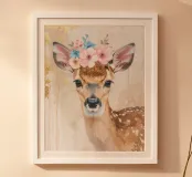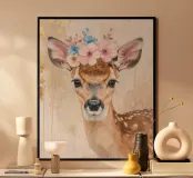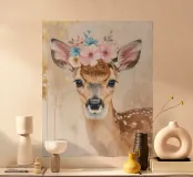 Questo design moderno raffigura un piccolo cervo con fiori sulla testa. Disegnato con delicati acquerelli e accenti dorati, unisce la bellezza naturale all'eleganza artistica. Le morbide sfumature di colore e lo stile astratto conferiscono a qualsiasi ambiente un'atmosfera romantica e giocosa, ma allo stesso tempo elegante: un vero e proprio colpo d'occhio per la vostra casa.