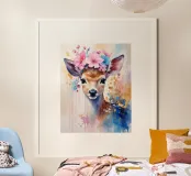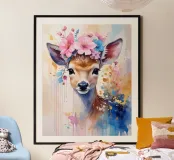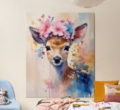 Questo design moderno raffigura un piccolo cervo con fiori sulla testa. Disegnato con delicati acquerelli e accenti dorati, unisce la bellezza naturale all'eleganza artistica. Le morbide sfumature di colore e lo stile astratto conferiscono a qualsiasi ambiente un'atmosfera romantica e giocosa, ma allo stesso tempo elegante: un vero e proprio colpo d'occhio per la vostra casa.