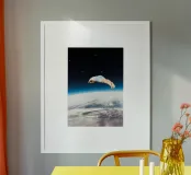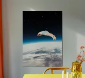 Un collage surreale che fonde il corpo umano con la vastità cosmica. Un tuffatore sospeso sopra la Terra trasforma il salto in una metafora di coraggio, libertà ed esplorazione dell'ignoto. Il contrasto tra la figura atletica e il cosmo infinito crea un'immagine suggestiva che unisce minimalismo e immaginazione onirica. Perfetto per chi apprezza l'arte moderna con un tocco surreale e cosmico.