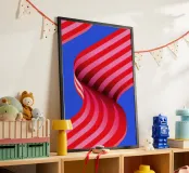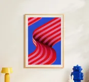 Primo piano di una fascia a strisce rosse e rosa su uno sfondo blu. Le strisce sovrapposte creano un aspetto 3D con movimento e profondità. Alta risoluzione, dettagli nitidi, transizioni di colore fluide. Effetto minimalista, elegante e dinamico.