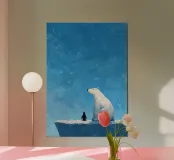 Un orso bianco e un pinguino siedono sul bordo di una banchisa e si guardano. L'illustrazione del libro per bambini presenta un design minimalista, semplici pennellate, colori pastello e un cielo azzurro e limpido - affascinante, amichevole e ricco di dettagli.