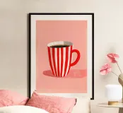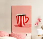 Illustrazione di una tazza di caffè con strisce rosse e bianche su sfondo rosa. Design piatto e minimalista con forme semplici, disegno a mano e texture a guazzo. Stile giocoso di ispirazione vintage, che ricorda le illustrazioni dei libri per bambini e trasmette un'atmosfera allegra ed estetica.