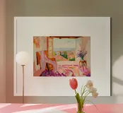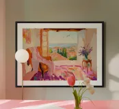 Un dipinto a olio ad Impasto digitale ad alta risoluzione che cattura un momento lussuoso e soleggiato in una stanza che si affaccia sul Mediterraneo. La scena è incorniciata da una porta-finestra aperta, che mostra tetti di terracotta rossa, cipressi e il mare turchese. L'interno è reso con pennellate eccezionalmente spesse ed espressive di pesca, arancione infuocato, viola deciso e rosa fucsia, che conferiscono al pavimento un sorprendente motivo astratto di colore e luce. Un'accogliente poltrona arancione, avvolta in un morbido scialle rosa, si trova accanto a un tavolino con un vaso di lavanda. Questo pezzo è una miscela perfetta di