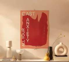 Un design minimalista che traduce la respirazione e la consapevolezza in forme e colori. Superfici delicatamente sovrapposte in verde tenue, rosa e nero formano uno sfondo calmo e organico. Le parole INHALE (orizzontale in alto a sinistra) ed EXHALE (verticale a destra) sono scritte in lettere maiuscole bianche e chiare: ridotte ma efficaci.