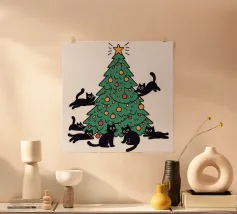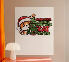 Un gatto nero che indossa un cappello da Babbo Natale è spiritosamente impigliato in luci natalizie colorate. Il testo accanto al gatto recita: "È abbastanza allegro?".