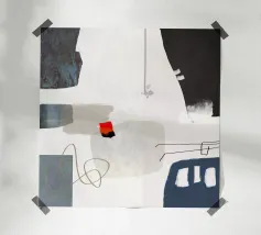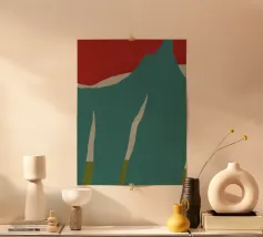 Vivace opera d'arte astratta minimalista. Il contrasto tra il rosso acceso e il verde scuro crea un'intrigante dinamica visiva. L'aggiunta delle tre forme arancioni luminose vicino al centro aggiunge un punto focale e migliora la composizione complessiva. Questa opera d'arte minimalista combina semplicità e complessità.