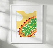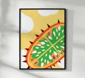 con il Kiwano (melone cornuto) tagliato, con la sua polpa verde brillante e i caratteristici semi bianchi, circondati da una buccia arancione e pungente.