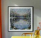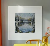 Questo accattivante dipinto a olio originale dà vita alla tranquilla bellezza di un paesaggio invernale. Utilizzando un'esclusiva tecnica a spatola, l'artista crea una texture di impasto straordinariamente spessa che fa sembrare la scena quasi tridimensionale. Il dipinto presenta maestose betulle con la loro caratteristica corteccia bianca e nera che incorniciano un lago calmo e riflettente. I toni freddi del blu, del grigio e del bianco dominano la tela, intervallati dai caldi accenni di oro e marrone del fogliame lontano. La pesantezza della pittura cattura le cortecce scoscese degli alberi e le dolci increspature del lago.