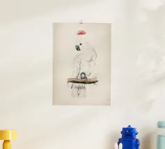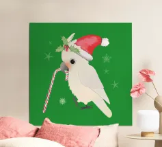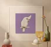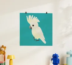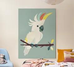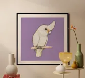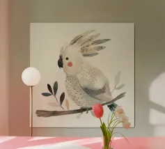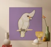 Dipinto ad acquerello di un simpatico cacatua di Goffin. La sua cresta è alzata. È in modalità relax.